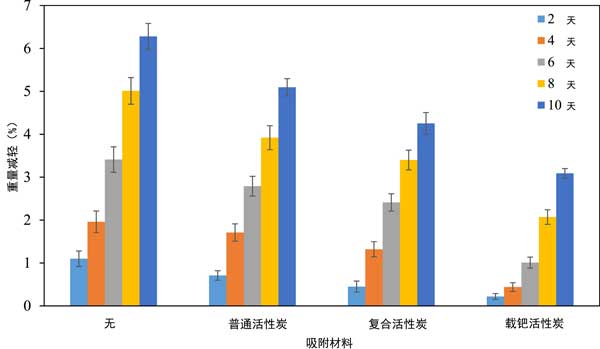 圖3:活性炭材料對(duì)貯藏2、4、6、8、10天香蕉失重的影響。