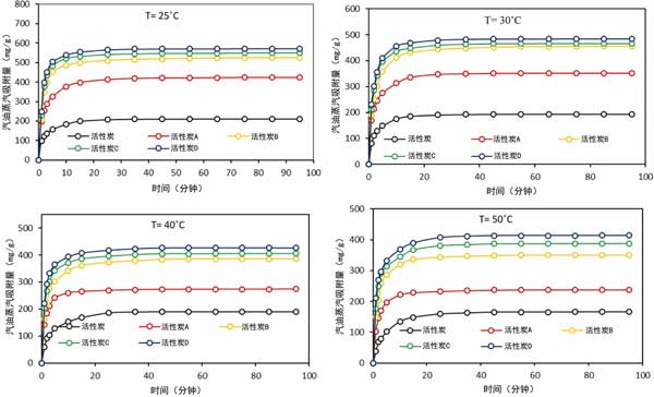 經(jīng)過(guò)進(jìn)一步研究,發(fā)現(xiàn)活性炭D樣品比其他樣品更能增強(qiáng)汽油蒸汽吸附,這表明表面結(jié)構(gòu)在捕獲分子方面的重要性和關(guān)鍵作用,正如預(yù)期的增強(qiáng)吸附一樣。事實(shí)上,與其他合成樣品相比,活性炭樣品具有更高的表面積和豐富的微介孔,可以顯著提高吸附量圖2。我們還研究了活性炭用量對(duì)吸附容量的影響。正如發(fā)現(xiàn)的那樣,隨著活性炭的用量增加,蒸汽吸附能力可以進(jìn)一步提高,這可能是由于通過(guò)提高活性炭量,表面積和孔隙反而增加,進(jìn)而可能有助于增強(qiáng)吸附。鑒于發(fā)現(xiàn)隨著活性炭用量比從1增加到4,汽油蒸氣吸附能力提高。