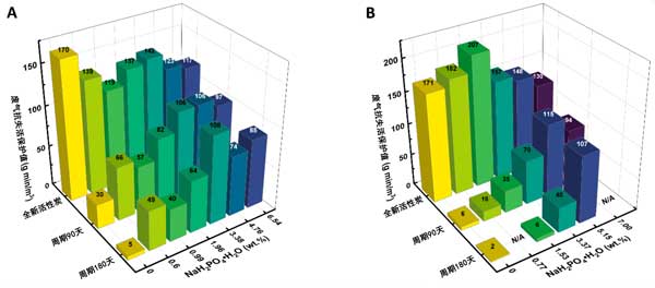 用磷酸三鈉12水合物(Na3PO4·12H2O)在活性炭上進行類似的實驗,活性炭失活后干燥。實驗在11.03wt.%的濃度下進行,相當(dāng)于4.00wt.%的NaH2PO4·H2O的摩爾當(dāng)量。很明顯,磷酸三鈉在抑制衰老方面并不有效。經(jīng)過3個月的加速失活,保護值甚至低于未改性的活性炭。然而,Na3PO4·12H2的效率可能會降低如果在酸性環(huán)境中或與酸或酸性化合物一起添加,效果會更好。這是因為酸性條件可以向磷酸鹽提供質(zhì)子,導(dǎo)致磷酸鈉有效地充當(dāng)Na2HPO4或NaH2PO4。總體而言,結(jié)果表明,在由磷酸及其三種鈉鹽組成的磷酸鹽添加劑中,一元鹽NaH2PO4·H2O是抑制失活最有效的添加劑。