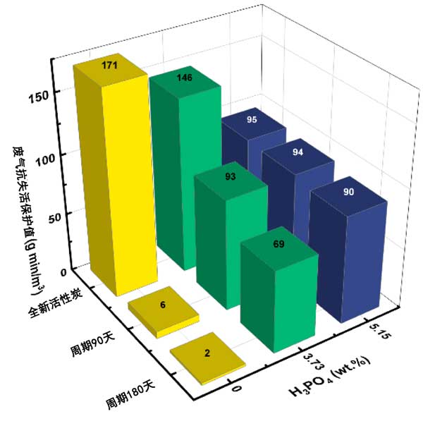 可以看出,濃度為5.15wt.%的磷酸對于抑制失活非常有效(加速失活6個月后保護值保持不變)。然而,添加5.15wt.%磷酸后,初始保護值(對于新碳)顯著降低,從171g/min/m3降至95g/min/m3。總體而言,磷酸是不如NaH2PO4有利的添加劑。