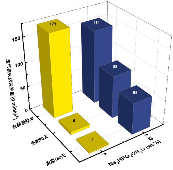 使用Na2HPO4·2H2O添加劑的實驗在6.52%的濃度下進行,其摩爾當(dāng)量相當(dāng)于5.15%的NaH2PO4·H2O濃度。圖3的結(jié)果表明,Na2HPO4·2H2O添加劑也能有效防止失活,但不如NaH2PO4·H2O有效。例如,失活180天后,防護值含有Na2HPO4·2H2O添加劑的活性炭濃度下降至65mg/min/m3相比之下,使用NaH2PO4·H2O添加劑的活性炭為107mg/min/m3。