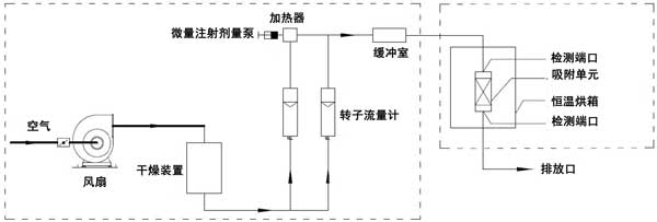 動態(tài)吸附實驗在室溫(25℃)下進行。實驗裝置由氣體分配系統(tǒng)和吸附系統(tǒng)兩部分組成。吸附系統(tǒng)由恒溫箱和吸附單元組成。檢測口位于吸附系統(tǒng)之前和之后。動態(tài)法測定活性炭對脈沖負荷緩沖性能的裝置如圖1所示。本實驗以乙醇或二甲苯為單一檢測對象。氣體分配系統(tǒng)包括風扇、干燥裝置、轉子流量計、微注射計量泵、加熱器和緩沖室。使用FT-IR傅里葉氣體分析儀作為測量設備。在氣體分配系統(tǒng)中,在短時間內(2分鐘和5分鐘),微注射計量泵的注射量迅速增加到原始體積的預定倍數(shù)(10倍和20倍),以產生脈沖負載。在吸附系統(tǒng)中,吸附單元內放置活性炭。吸附單元的直徑為31mm;钚蕴康奶畛涓叨确謩e為2cm、4cm、6cm、8cm。將吸附裝置置于恒溫箱內。吸附劑和吸附物的入口空氣保持在室溫。進行了吸附劑在室溫下吸附吸附質的脈沖加載實驗。潔凈空氣通過干燥裝置后,利用轉子流量計將其按特定比例分成兩個通道。通過微注射泵將特定濃度的乙醇或二甲苯氣體注射到氣體中。另一種氣體用作稀釋氣體。兩種氣體流入緩沖室,完全混合后進入恒溫箱。穩(wěn)定的氣體按照實驗設定的濃度、流量和溫度進入吸附單元。在通過吸附單元之前和之后測量乙醇或二甲苯的濃度。