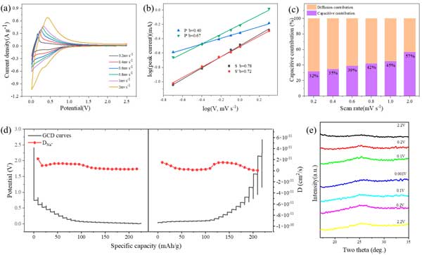圖4:(a)活性炭從0.2到2mVs-1的CV曲線。(b)峰值電流與確定b值時的掃描速率之間的關(guān)系。(c)不同掃描速率下電容和擴(kuò)散主導(dǎo)容量的百分比貢獻(xiàn)。(d)活性炭電極的GITT測試結(jié)果。(e)活性炭電極在鈉化和脫鈉各個階段的異位XRD譜。