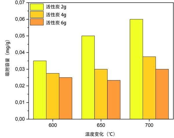 從測(cè)試結(jié)果可以看出,在700℃溫度下,吸附劑質(zhì)量為6g,濃度為0.2mg/L,降低百分比為90%。氨(NH3)濃度的降低與質(zhì)量變化的增加和活化溫度的升高成正比。吸附劑質(zhì)量越大且溫度越高,氨(NH3)濃度降低得越多。在圖2中,顯示了活性炭的吸附容量值。因此,可以得出結(jié)論,吸附劑質(zhì)量為2g、溫度為700℃時(shí)達(dá)到最高吸附容量,即0.06 mg/g。然而,盡管700℃下6g吸附劑質(zhì)量顯示出氨(NH3)濃度百分比降低,但與700℃下2g吸附劑質(zhì)量相比,其吸附容量仍然較低,為0.03mg/g。這是由于NH3吸附過程是由分子間相互作用驅(qū)動(dòng)的,例如靜電引力、氫鍵、范德華相互作用等。此外,結(jié)果表明,源自肉豆蔻殼的活性炭可以有效降低氨(NH3)水平。那么活性炭具有良好的穩(wěn)定性,并通過吸附容量值證明。