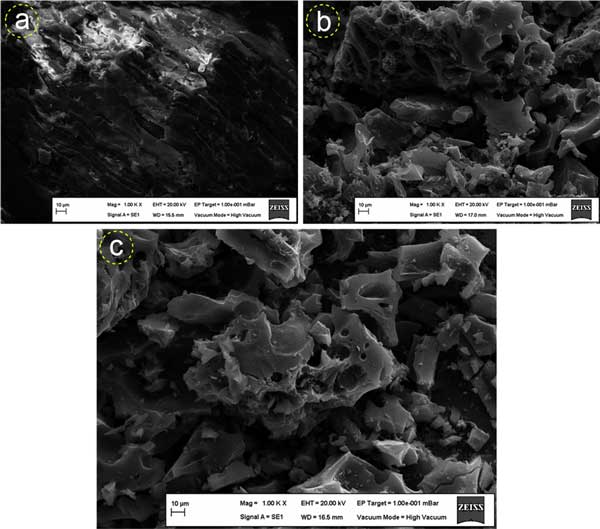圖2:原材料(a)、活性炭(b)和處理后的活性炭(c)的SEM照片。