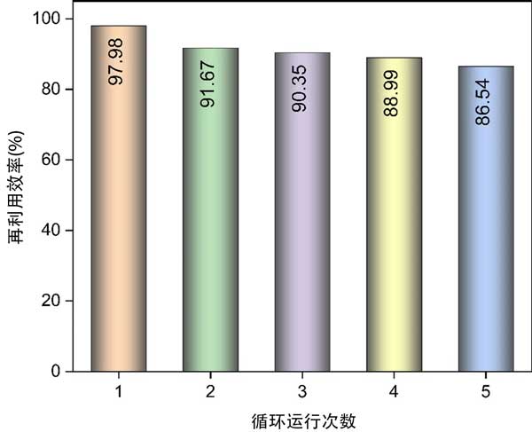 吸附劑的可重復(fù)使用性和吸附穩(wěn)定性在評估所開發(fā)方法的實際適用性方面起著至關(guān)重要的作用。事實上,吸附劑的可重復(fù)使用性能是實際應(yīng)用的首要標(biāo)準(zhǔn),并影響吸附過程的總體成本;钚蕴勘秸羝降脑倮眯适窃谖鍌連續(xù)的回收循環(huán)后確定的。如圖4所示,經(jīng)過五次連續(xù)回收過程后,活性炭苯蒸氣的再利用效率為86.54%。強大的可重復(fù)使用性和吸附穩(wěn)定性表明活性炭吸附劑和苯吸附物之間存在范德華力或π-π相互作用。相反,不完全的再生過程可歸因于吸附表面上永久鍵的形成,導(dǎo)致吸附基團的不可逆轉(zhuǎn)化。換句話說,一些在再生過程中未解吸的化學(xué)結(jié)合吸附物可能會堵塞孔隙,導(dǎo)致殘留物形成。