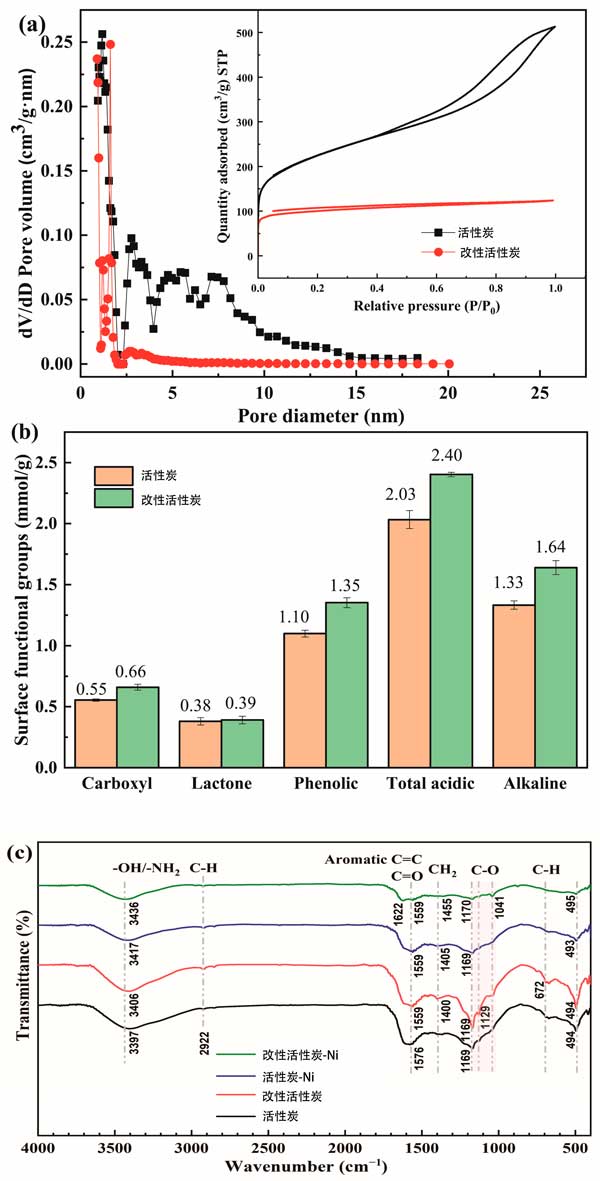圖1:活性炭和改性活性炭的表征:(a)孔徑分布和氮?dú)馕?解吸等溫線;(b)通過Boehm滴定進(jìn)行表面官能團(tuán)分析;(c)Ni(II)吸附前后的FTIR光譜。