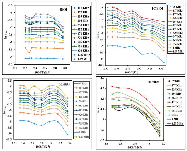 圖4:溫度對BiOI、1C/BiOI、5C/BiOI和10C/BiOI納米復合材料在不同頻率下交流電導率的影響。