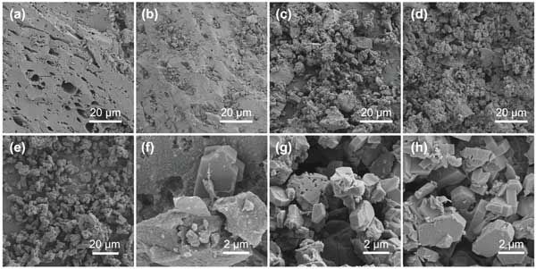 圖2:(a)活性炭、(e)分子篩、(b,f)活性炭復合材料-10%在不同放大倍數(shù)下的SEM圖像,(c,g)活性炭復合材料-20%在不同放大倍數(shù)下的SEM圖像,以及(d,h)活性炭復合材料-30%在不同放大倍數(shù)下的SEM圖像。