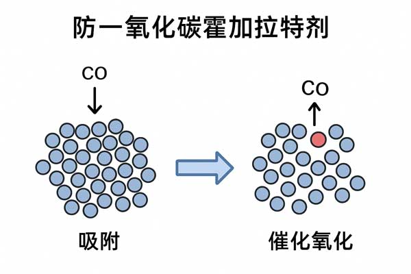 防一氧化碳霍加拉特劑的工作機制主要依靠催化反應和表面吸附相結(jié)合: