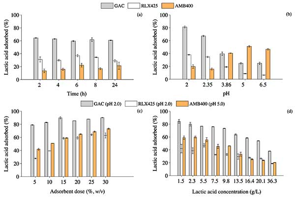 目前的研究表明,活性炭是一種好的吸附劑。然而,吸附在吸附劑上的乳酸的量不能作為選擇合適吸附劑的唯一參數(shù)。另外,活性炭的吸附能力經(jīng)過不同的吸附和解吸循環(huán)后可以降低,因此活性炭的長期性能對選擇最經(jīng)濟(jì)可行的材料至關(guān)重要。從吸附劑中解吸乳酸是一個重要的因素,需要作為下游加工策略來考察,但超出了本研究的范圍。