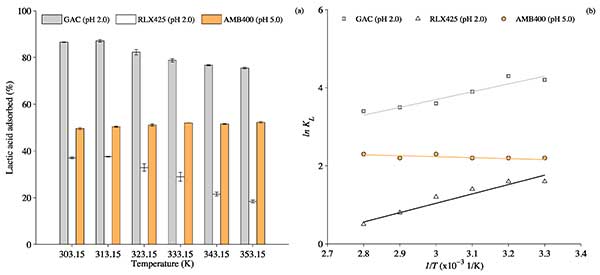 圖2. (a)溫度(30-80°C)對本體溶液中4.5 g / L乳酸吸附容量的影響伴隨著初始pH校正和10%(w / v)吸附劑劑量(b)在30-80°C的溫度范圍內(nèi),在4.5g / L的乳酸濃度下ln K L相對于1 / T的圖。