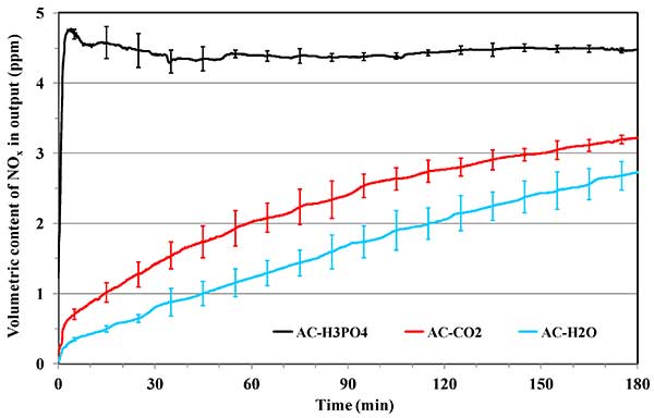 盡管用于汽車和工業(yè)廢氣都實施了減排措施,城市人口與車輛的增加導(dǎo)致了更多氮氧化物的排放。使用木質(zhì)纖維為前體制造的活性炭在環(huán)境溫度去除氮氧化物。這些活性炭吸附劑表現(xiàn)出令人感興趣的吸附容量范圍在40mg/g和120mg/g之間。然而,這些活性炭的性能通常在干燥和潮濕條件下在空氣存在下在500-1000ppmNO濃度下進行評估。