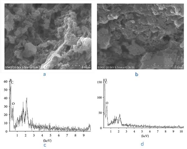 圖3:(a)活性炭負載鋯和(b)氟化物吸附的活性炭負載鋯的SEM圖像,以及(c)活性炭負載鋯和(d)氟化物吸附的負載鋯的EDAX譜圖。