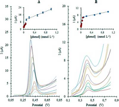 圖2、使用DPV方法在的氧化鎳活性炭自來(lái)水中(A)和橄欖油(B)樣品的苯酚校準(zhǔn)曲線改性的碳電極在1.0的濃度范圍 × 10 -6 mol L−1至1.0 × 10 -3 mol L−1。