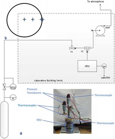 使用設(shè)計(jì)為模擬自冷卻罐的換熱機(jī)組(HEU)為200mL容積的圓柱形容器進(jìn)行實(shí)驗(yàn)。該設(shè)備在圖1中示意性地示出; 參見(jiàn)圖1a中的照片。換熱機(jī)組(HEU)的主體由鋁制成,并用黃銅蓋封閉。水浴也是實(shí)驗(yàn)裝置的一部分。
