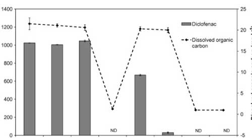 使用活性炭除去雙氯芬酸鈉是定性高效的,通過零吸收和低濃度的DOC的,并且在通過所獲得的色譜中沒有檢測到雙氯芬酸鈉。得在所研究的處理階段中,在活性炭上的吸附導(dǎo)致最顯著的雙氯芬酸鈉去除。因此,雙氯芬酸鈉沒有水樣中的這個階段(LOD之后檢測 = 2 μg L−1)?紤]到所述方法的定量限為3 μg L−1,通過活性炭除去雙氯芬酸鈉的至少99.7%。因為沒有研究活性炭的破裂曲線,所以活性炭的結(jié)果可以被認(rèn)為是定性的。然而,為了研究在大型水處理廠中去除雙氯芬酸鈉,必須改進該方法以達到較低的檢測限(約μg L−1)。