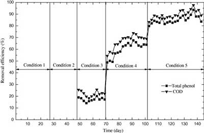 圖1。在1-5的條件下活性炭的COD和苯酚去除效率。