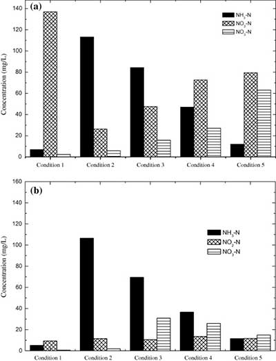 圖2。在條件1-5下短程生物脫氮反應(yīng)器出口的NH 3 -N,NO 2 -N和NO 3 -N濃度對(duì)比。(a)好氧隔室和(b)缺氧隔室。