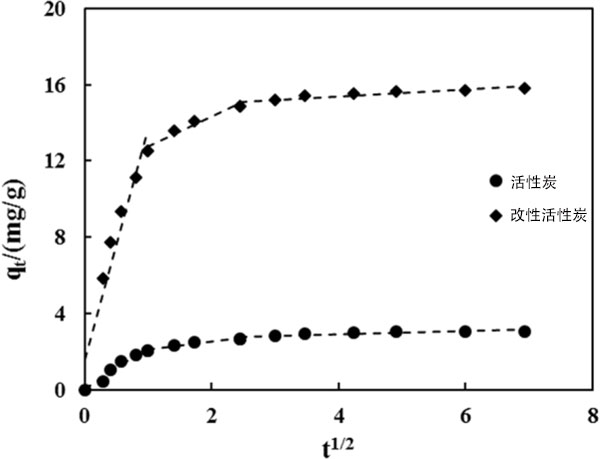 磺胺二甲嘧啶在活性炭和改性活性炭上的吸附和擴(kuò)散過程可分三個(gè)階段描述,如圖2所示。由于在第一階段吸附在活性炭表面上,吸附速率最初很高。然后,發(fā)生快速的顆粒內(nèi)擴(kuò)散過程,其中磺胺二甲嘧啶逐漸吸附在活性炭上,并且吸附速率常數(shù)逐漸降低。在第三階段,邊界層和傳質(zhì)阻力的影響增加,導(dǎo)致顆粒內(nèi)擴(kuò)散減慢。所有三個(gè)階段的擬合方程都沒有通過坐標(biāo)的原點(diǎn),這表明顆粒內(nèi)擴(kuò)散不是控制吸附速率的唯一步驟。因此,吸附過程也受膜擴(kuò)散和表面吸附的影響。