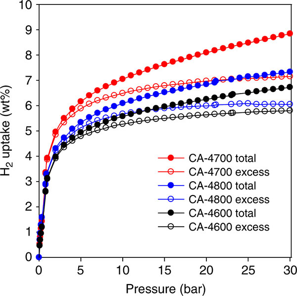 活性炭中的氫儲(chǔ)存需要具有最高表面積和適當(dāng)尺寸的孔的材料。在-196和25℃下使用重量法在HidenXEMIS分析儀上在0-30巴的壓力范圍內(nèi)研究活性炭的儲(chǔ)氫能力。圖2顯示了活性炭在-196℃下的過量和總氫吸收等溫線。對(duì)于所有CA-4T活性炭,氫吸收是可逆的,沒有滯后現(xiàn)象,并且在0-30巴的壓力范圍內(nèi)沒有達(dá)到飽和。我們首先注意到1巴的氫吸收非常令人印象深刻,在3.1-3.9wt%的范圍內(nèi)。這種儲(chǔ)氫比為高表面積活性炭?jī)A向于在2-3重量%范圍內(nèi)的任何報(bào)告的值高得多。我們將這種特別高的吸收特性歸因于非常高的微孔表面積和富氧表面的組合,特別是對(duì)于3.9重量%的活性炭樣品CA-4700。富氧表面的效果是對(duì)于活性炭樣品CA-4600,其盡管具有適度總表面積和微孔表面,仍然表現(xiàn)出的吸收比以前發(fā)現(xiàn)的活性炭材料具有高得多的表面積。經(jīng)過研究發(fā)現(xiàn),具有氧官能團(tuán)的活性炭效果預(yù)期在低壓下具有最大效果,其中氫和表面之間的相互作用比在較高壓力下更重要,其中通過空間填充機(jī)制更可能發(fā)生氫吸收。