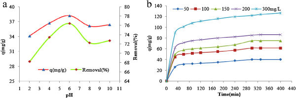圖4、pH值(a)在濃度=50 mg/L和接觸時間(b)對濃度=50-300 mg/L的影響,苯胺吸附在活性炭上,W=1 g/L T=20℃。