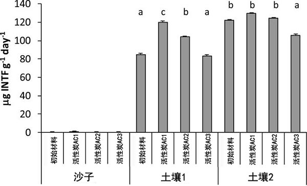 圖2:在具有不同活性炭修復(fù)的沙子和土壤中的脫氫酶活性。