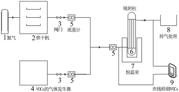 在吸附柱中研究了活性炭吸附甲苯的能力;钚蕴康挠昧繛10g,吸附質(zhì)甲苯氣體由氣體發(fā)生器產(chǎn)生。通過測定吸附前后甲苯的濃度,得到了不同條件下活性炭吸附性能的數(shù)據(jù)。實(shí)驗(yàn)吸附裝置的流程圖如圖2所示。將來自氣體發(fā)生器的甲苯氣體與氮?dú)饣旌,然后將其吸附在恒溫吸附塔中。通過在線FID檢測器測量吸附前后的甲苯含量,并通過流量計(jì)控制甲苯流量。當(dāng)脫氣和入口濃度在30分鐘內(nèi)保持一致時(shí),認(rèn)為已達(dá)到吸附平衡。吸附氣體通過廢氣出口排空。