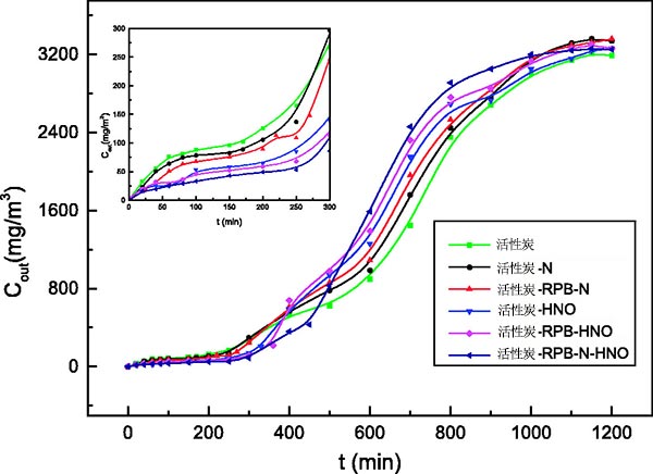 甲苯在不同活性炭上的穿透曲線和吸附等溫曲線如圖3所示和4。不同活性炭上的吸附速率從高到低依次為:活性炭-RPB-N-HNO>活性炭-RPB-HNO>活性炭-HNO>活性炭-RPB-N>活性炭-N>原始活性炭。吸附速率越大,滲透時(shí)間越長,這又與活性炭的復(fù)雜孔徑分布和表面官能團(tuán)的量有關(guān);钚蕴康奈⒖左w積在高溫氮?dú)庵性龃,這增加了活性炭通道的內(nèi)部孔隙體積。在高重力氮?dú)猸h(huán)境中,不利于甲苯吸收的原始活性炭的內(nèi)部結(jié)構(gòu)被重新分配并分裂成新的空間構(gòu)型,這進(jìn)一步增加了突破時(shí)間。HNO 3處理的活性炭的突破時(shí)間在高重力環(huán)境中的改性大于具有HNO 3浸泡的改性活性炭。這是因?yàn)镠NO 3分散的細(xì)小液滴中,這增加了其與活性炭的表面和內(nèi)部的接觸概率,這反過來增強(qiáng)了活性炭上含氧官能團(tuán)的負(fù)載并增加了它們的吸附效率。在重力作用下,復(fù)合改性處理的活性炭具有較長的穿透時(shí)間和較大的吸附速率,因?yàn)槲锢砀男栽黾恿吮缺砻娣e,增大了孔體積分布,而化學(xué)改性增加了表面氧基團(tuán)數(shù)。反過來,這些特性增強(qiáng)了吸附性能。