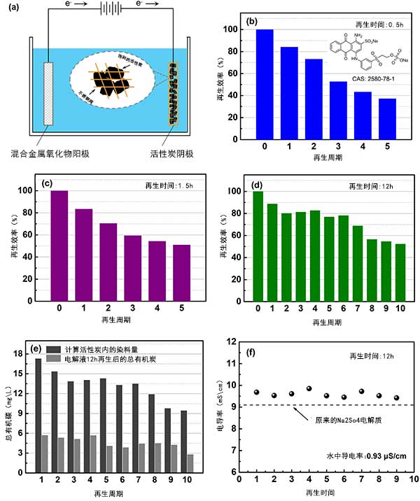 圖1。再生時(shí)間對(duì)RE和總有機(jī)碳(TOC)去除的影響。(a)設(shè)置示意圖。(b)-(d)當(dāng)再生時(shí)間分別為0.5小時(shí)(b),1.5小時(shí)(c)和12小時(shí)(d)時(shí),RE的變化。(e)再生12小時(shí)后的電解質(zhì)TOC,并計(jì)算吸附在活性炭上的RB19的TOC。(f)12小時(shí)后電解質(zhì)的電導(dǎo)率超過10次再生。
