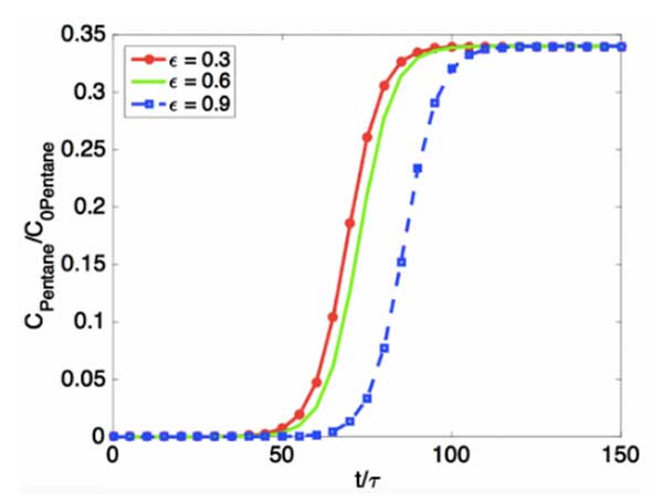 模擬三種不同孔隙率的活性炭的吸附動力學(xué)(圖2)。通過多組分加權(quán)平均計算C/C0(我們模擬每種組分的吸附動力學(xué),計算它們相應(yīng)的穿透曲線,并根據(jù)它們在原始油蒸氣中的體積分?jǐn)?shù)得出加權(quán)平均值)。從圖3中可以看出,較高的孔隙率可以在較長的穿透時間內(nèi)重新產(chǎn)生,這與較高的孔隙率將導(dǎo)致較高的表面積并且將使反應(yīng)器中的吸附物的停留時間更長的事實一致。