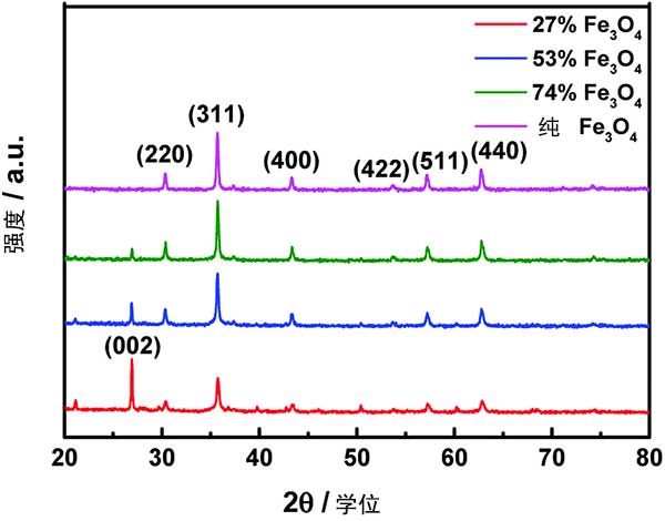使用XRD衍射儀測量活性炭復(fù)合物的晶體結(jié)構(gòu)。圖1顯示了所制備樣品的衍射圖案。在2的特征衍射峰θ= 31.24°,36.82°,44.76°,55.62°,59.30°和65.19°的與(220),(311),(400),(422),(511)和(440)Fe 3 O 4平面一致。此外,在約2峰值θ=26.20°被分配給蓬松結(jié)構(gòu)化活性炭。觀察到Fe 3 O 4衍射峰的強度隨著Fe 3 O 4納米顆粒負載量的增加而增強,并且活性炭的強度在相同的過程中減少。上述現(xiàn)象表明Fe 3 O 4納米顆?梢猿晒Φ匾肱钏山Y(jié)構(gòu)的活性炭上。