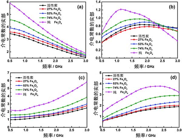 此外,研究了活性炭復(fù)合材料的電磁波吸收性能。圖4顯示復(fù)介電常數(shù)和導(dǎo)磁率,這些電磁參數(shù)對于確定微波吸收復(fù)合材料的介電和磁損耗非常重要,并且在吸收過程中電磁波的傳輸和反射也受它們的影響。從圖6(a)和(b)中,可以觀察到,所有樣品的介電常數(shù)的實部與增加頻率。圖6(c)和(d)顯示了磁導(dǎo)率的實部和虛部作為頻率的函數(shù)。觀察到當(dāng)活性炭的負載量低時,滲透率的實部僅略微增加。
