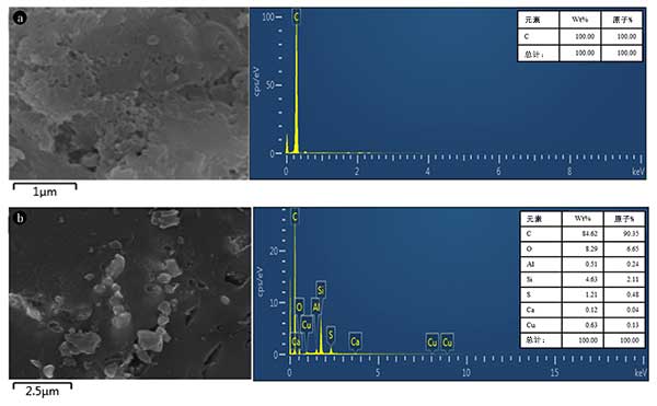 圖1:(a)活性炭和(b)改性活性炭的SEM圖像和EDS圖案。