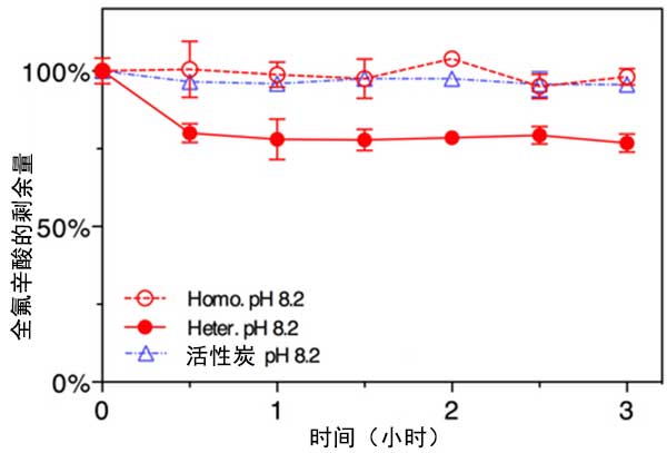 在存在和不存在活性炭的情況下,在密封的40mL燒瓶中在酸性,中性和堿性pH條件下進行全氟辛酸與S 2 O 8的反應,反應溫度為80℃,用恒溫水浴保持。對于大多數(shù)實驗,初始全氟辛酸濃度為0.5μM,活性炭濃度為200 mg/L,500 mg/L或1000 mg/L。對于酸性和堿性條件實驗,使用濃硫酸或150mM氫氧化鈉溶液將pH值調節(jié)至1.0或13.0。對于在pH 8.2下進行的實驗,使用100mM硼酸鹽作為緩沖液(NaB(OH)4/H 3 BO 4)。在所有實驗中包括五個重復。