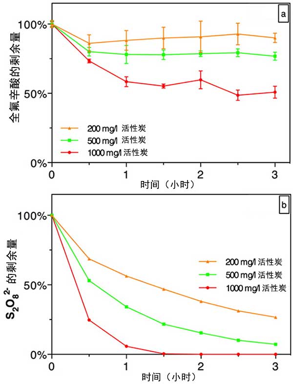 圖2;钚蕴繚舛葘瘜W吸附去除全氟辛酸(圖2a)和過硫酸鹽分解(圖2b)的影響。