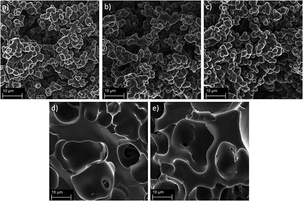 通過(guò)掃描電子顯微鏡對(duì)高比表面積活性炭進(jìn)行表征于圖2a-c中。可以看出的是這幾種活性炭具有它是由球形碳顆粒的尺寸與周圍3μm的孔隙網(wǎng)絡(luò)結(jié)構(gòu),這是典型的基于甲醛樹脂活性炭。球形活性炭納米顆粒的燒結(jié)導(dǎo)致孔隙網(wǎng)絡(luò)內(nèi)的空腔,其在直徑為2至20μm的形成。活性炭表面是光滑的,沒(méi)有燒結(jié)的球形活性炭納米顆粒,而它們?nèi)匀辉诰W(wǎng)絡(luò)內(nèi)具有相似直徑的空腔。由于在化學(xué)活化之前低的預(yù)碳化溫度,球形納米顆粒在活化過(guò)程中強(qiáng)烈聚集,這導(dǎo)致如前所述的較不剛性的孔隙網(wǎng)絡(luò)。