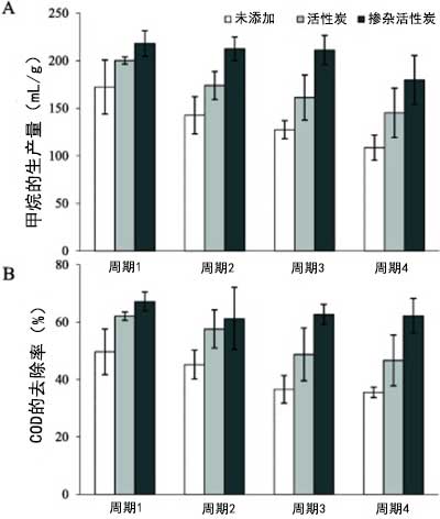 圖2:(A)四個(gè)連續(xù)活性炭補(bǔ)料分批循環(huán)中的平均特定甲烷產(chǎn)量和(B)COD去除效率。