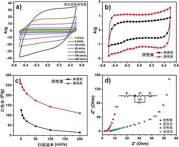 在不同掃描速率下觀察到兩種活性炭的準(zhǔn)矩形CV曲線(圖3a),這暗示了非理想的電容行為。我們還觀察到活化后的活性炭的CV環(huán)路較大,這意味著它具有比未活化的活性炭更大的電容(圖3b)。具體電容的總結(jié)如圖3c所示,活化后活性炭獲得的高電容為270,而沒活化的活性炭為125。這種高電容可歸因于諸如高表面積,分級(jí)孔徑分布和活性炭的表面潤(rùn)濕性等因素。對(duì)于兩種活性炭,由于電解質(zhì)不足以擴(kuò)散到電極材料的內(nèi)孔中而觀察到對(duì)應(yīng)于掃描速率增加的比電容的降低。