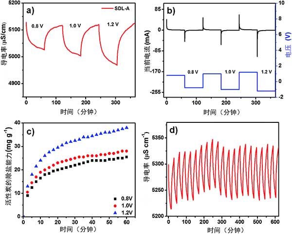 在充電步驟期間,在兩個(gè)電極上向膜電容去離子施加正電勢(shì),以從已知NaCl濃度的溶液中吸附離子,并施加負(fù)電位以使電極放電并排出廢物流中的離子。圖4a顯示了在NaCl溶液中0.8V至1.2V的各種電位下,活性炭在初始濃度2500mg L-1下的脫鹽性能。在所有施加的電位中,在充電期間首先觀察到溶液電導(dǎo)率的急劇下降,并且當(dāng)吸附接近平衡時(shí),電導(dǎo)率的變化減小直至達(dá)到平臺(tái)。圖4b示出了具有增加電勢(shì)的正相關(guān)電流瞬變,而圖4c顯示了活性炭電極在不同施加電位下的鹽吸附容量。從0.8V到1.2V,鹽吸附容量從23增加到38mg g-1,表明更高的電池電位可以提高電吸附能力。觀察到的現(xiàn)象可歸因于強(qiáng)靜電力的存在以及在增加的電壓下形成較厚的雙電層。圖4d示出了活性炭電極的循環(huán)穩(wěn)定性,在2500mg L-1的NaCl溶液超過(guò)20次充放電循環(huán)而沒有去除能力任何明顯的損失。該結(jié)果證實(shí)了使用活性炭當(dāng)電極可以再生和重復(fù)使用而沒有任何損耗,活性炭是成為用于膜電容去離子應(yīng)用的電極材料的好材料。
