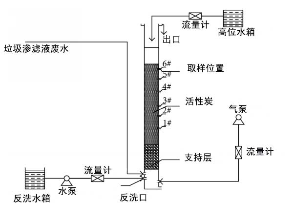 活性炭反應(yīng)器工藝流程圖如圖1所示。活性炭池由有機玻璃制成,有機玻璃是柱式反應(yīng)器;钚蕴砍馗叨葹2米。內(nèi)徑為63毫米。填充高度為1800毫米。碳層高度為1500毫米。砂濾器高度為300毫米。反應(yīng)體積為4.7 L.有5個水取樣口和碳池。底部有曝氣器,碳池頂部有溢流堰。水質(zhì)分析指標為紫外分光光度法和紫外分光光度計。