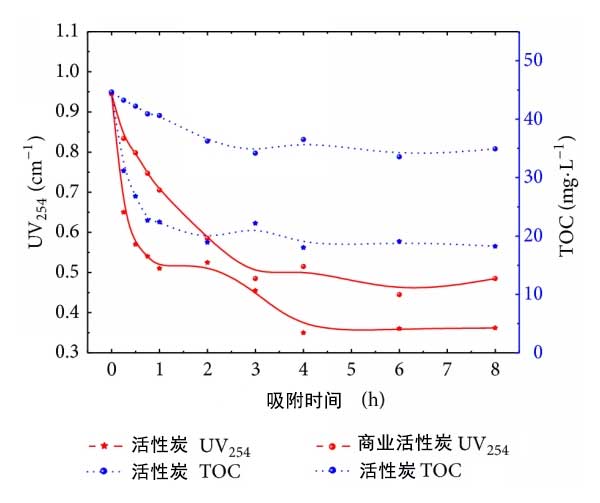 根據(jù)圖4,活性炭表現(xiàn)出良好的吸附生化水的性質(zhì)。UV254和TOC的濃度具有類似的變化趨勢。UV254和TOC的去除效率分別為63.0%和59.7%。商業(yè)活性炭的吸附性能較弱。UV254和TOC的去除率僅為52.9%和24.8%。商業(yè)活性炭的孔體積小于活性炭的孔體積。圖4中活性炭的UV254去除曲線分為兩個階段,它們分別對應(yīng)于膜擴散和粒子擴散。