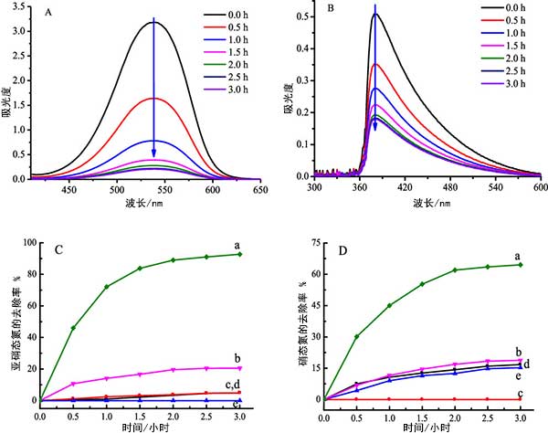 亞硝酸鹽和氨的記錄的紫外可見吸收光譜分別在圖3中。圖3AB明確顯示當(dāng)活性炭用作光催化劑時(shí),在厭氧條件下,亞硝酸鹽和氨的濃度與輻照時(shí)間同時(shí)下降。對照試驗(yàn)也在活性炭催化劑存在或不存在下進(jìn)行,照射或在黑暗中或不存在一種組分時(shí)進(jìn),亞硝酸鹽和氨的去除率如圖3CD所示。在活性炭鋅鐵氧體照射下,氨降解的平均去除率達(dá)到64.3%,而在沒有活性炭的情況下去除率僅為18.8%。結(jié)果明顯的是的活性炭鋅鐵氧體具有同時(shí)去除亞硝酸鹽和氨的光催化功能。