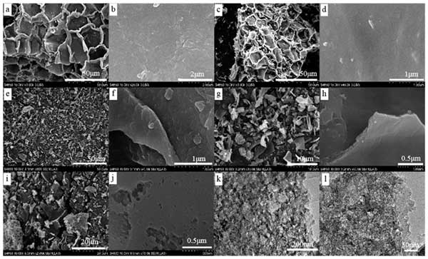 通過(guò)SEM和TEM研究了空氣氧化前后活性炭的微觀結(jié)構(gòu)(圖2)。在(圖2a,b)中,軟木材料呈蜂窩狀結(jié)構(gòu)并具有明顯的褶皺。在800℃碳化后,保留結(jié)構(gòu)并且包含該結(jié)構(gòu)的部分彼此緊密結(jié)合,看起來(lái)光滑(圖2c,d)。在350℃-450℃下空氣活化后,結(jié)構(gòu)單元被分離形成薄片(圖2e),這可歸因于細(xì)胞之間木質(zhì)素的降解;钚蕴砍尸F(xiàn)出層狀空氣氧化后的結(jié)構(gòu)(圖2的e-j)的。350℃和400℃活化的活性炭樣品表面相對(duì)光滑,在0.5-1μm的分辨率下未觀察到明顯的孔結(jié)構(gòu)(圖2f,h)。當(dāng)氧化溫度升至450℃時(shí),活性炭的表面顯著變化并觀察到大量的孔。圖2j顯示450℃活化樣品顯示出具有裂縫和空隙的粗糙表面。TEM結(jié)果(圖2k,i)顯示450℃活化的活性炭具有三維(3D)互連框架的分級(jí)微/中孔結(jié)構(gòu)。這些孔可以有助于廢水中染料的吸附。