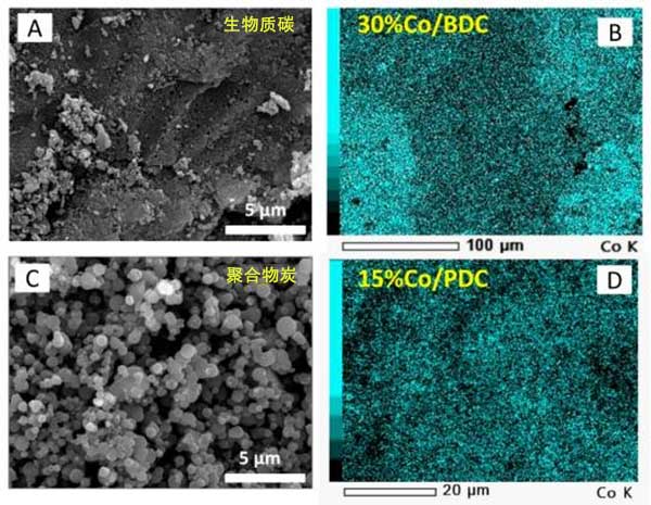 使用掃描電子顯微鏡(SEM)觀察由植物殼和酚醛樹脂的熱解獲得的活性炭的表面形態(tài),并分別在圖1A,C中示出。可以看出,不同的碳前體產(chǎn)生不同的表面形態(tài)。生物質(zhì)衍生的碳顯示出剛性和致密的結(jié)構(gòu),這是典型的木炭特征。而聚合物衍生的碳呈現(xiàn)具有粒子網(wǎng)絡(luò)的碳球,在球體之間產(chǎn)生大的空隙。然后將兩種活性炭用作氧化鈷的載體。為了觀察金屬氧化物在活性炭上的分散,進行了SEM與能量色散X射線(EDX)的元素映射。圖1B,D表示裝載在兩種材料中的氧化鈷的代表。所有都顯示鈷材料(在青色中顯示)在活性炭中的均勻分散。這表明通過浸漬方法中描述的簡單化學(xué)計量計算很好地實現(xiàn)了元素鈷的目標(biāo)負(fù)載。換句話說,上述結(jié)果清楚地顯示了制備氧化鈷活性炭的成功制備步驟。
