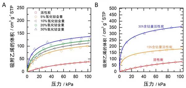 測試氧化鈷浸漬的活性炭的性能以進行乙烯吸附。圖2A顯示在具有和不具有0-101kPa壓力范圍的氧化鈷活性炭中的乙烯吸附等溫線。吸附乙烯的體積定義為標(biāo)準(zhǔn)溫度和壓力下的體積。通常,可以看出乙烯吸收隨著壓力的增加而增加。大量乙烯吸附至40kPa壓力。當(dāng)將壓力增加到40kPa以上時,所有樣品可以進一步吸附少量乙烯(添加10%-25%)。氧化鈷浸漬的活性炭是無負(fù)載的活性炭兩倍的乙烯吸附量,它清楚地表明氧化鈷在增強活性炭對乙烯吸附方面效果比較好。增加氧化鈷的含量進一步增加了乙烯在氧化鈷浸漬的活性炭上的吸附能力。當(dāng)使用30%氧化鈷時能達到較高吸附容量。