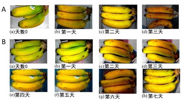 圖3A,B分別顯示了在沒有和使用氧化鈷浸漬的活性炭在封閉存儲期間的水果條件的日常記錄。使用活性炭15%氧化鈷材料,進行半定量檢查(即顏色和棕色區(qū)域)。當(dāng)棕色主要出現(xiàn)時,長期保存時間被定義,并且香蕉從束中掉出來。當(dāng)將香蕉存放在沒有活性炭吸附劑的封閉盒子中時,水果很快變得腐爛。僅在第三天,一束香蕉已經(jīng)從束中掉出來并出現(xiàn)棕色斑點。使用活性炭吸附劑情況下,可以清楚地看到水果保存時間的延長。相對于沒有活性炭,顏色的變化被延遲(圖3B)。結(jié)果表明氧化鈷浸漬的活性炭作為乙烯清除劑在儲存系統(tǒng)中的效果,因此延長了水果的儲存壽命。