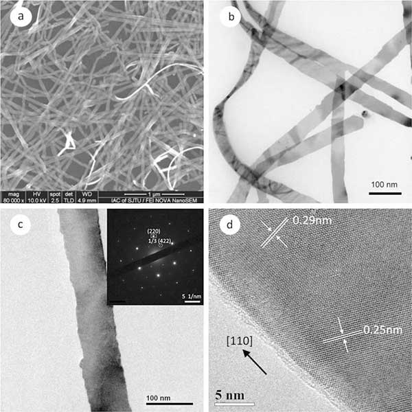 圖1顯示了在活性炭上生長的銀納米帶的典型電子顯微鏡(EM)圖像。SEM圖像(圖1a)顯示獲得了豐富的線狀產(chǎn)物,具有非常少的準(zhǔn)球形顆粒雜質(zhì)。圖1b是銀納米帶的典型TEM圖像。該圖中所示的納米帶的平均寬度為約45納米。從左側(cè)附近的扭曲納米帶測量的厚度為約9納米。位于TEM網(wǎng)格上的這種平坦且光滑的納米結(jié)構(gòu)也通過右側(cè)的莫爾圖案來證實(shí),其源自具有不同晶體取向的兩個(gè)或三個(gè)納米帶的堆疊。圖1c呈現(xiàn)單個(gè)納米帶的TEM圖像。其選擇區(qū)域電子衍射(SAED)圖案插入右上角,具有六重對稱性。