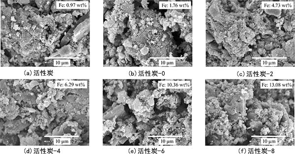 載鐵活性炭的SEM照片如圖1所示。載鐵活性炭具有片狀石墨填充結構的表面形態(tài),其顯示產生大量微孔。對于所有活性炭,觀察到小的聚集體,其看起來更亮并且在活性炭的較暗表面上得到支撐。細氧化鐵顆粒傾向于覆蓋活性炭的表面而不是均勻地分散在整個表面上。作為四氧化三鐵的添加量增加,活性炭表面的聚集增加。通過能量分散X射線(EDX)分析(未顯示),證實聚集體是含鐵化合物。樣品的鐵含量顯示在圖1中每張圖的右上角。