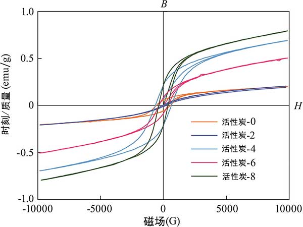 活性炭的磁滯回線如圖3所示。隨著鐵含量增加,活性炭的飽和磁化強度首先降低并隨后增加;钚蕴康娘柡痛呕瘡姸戎蹬c活性炭中殘留的四氧化三鐵和金屬鐵的量有關,因為它們具有磁效應;钚蕴康奶囟ù呕适谴欧蛛x的重要參數(shù)之一。